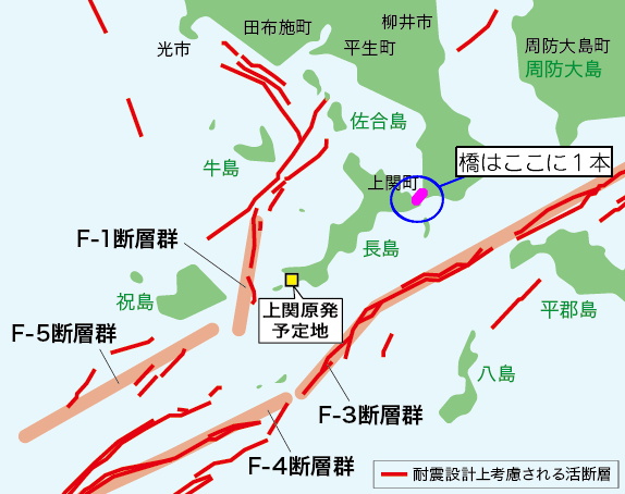 右の地図は、上関原発周辺の活断層かつだんそう の地図よ。この原発予定地周辺では、過去にもM6〜7以上の地震があったの。これからも震度6以上の地震が発生する危険性があるとのことよ。