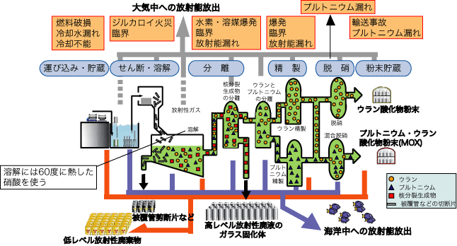 - 再処理工場は、核施設としての危険性と化学工場としての危険性をあわせもつことになります。工場では引火点の低い有機物質が多量に使われるため、火災や爆発事故の可能性も低くなく、実際燃料棒のさや火災はイギリスのセラフィールド、フランスのラ・アーグで起きています。